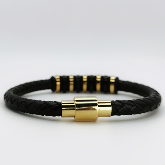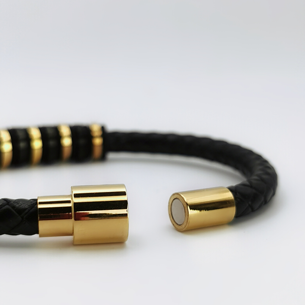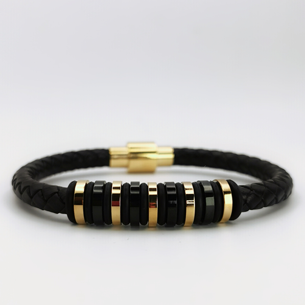 Prezentujemy stylową bransoletkę męską, która łączy w sobie elegancję oraz męski charakter. Centralną część bransoletki stanowią wyraziste elementy w kolorze głębokiej czerni, przeplatane złotymi akcentami, dodającymi szyku i wytworności. Całość została utkana z wytrzymałego, czarnego sznurka, co zapewnia nie tylko trwałość, ale i wygodę noszenia.