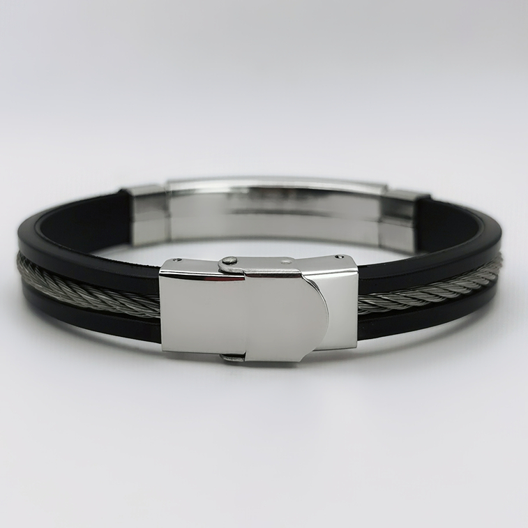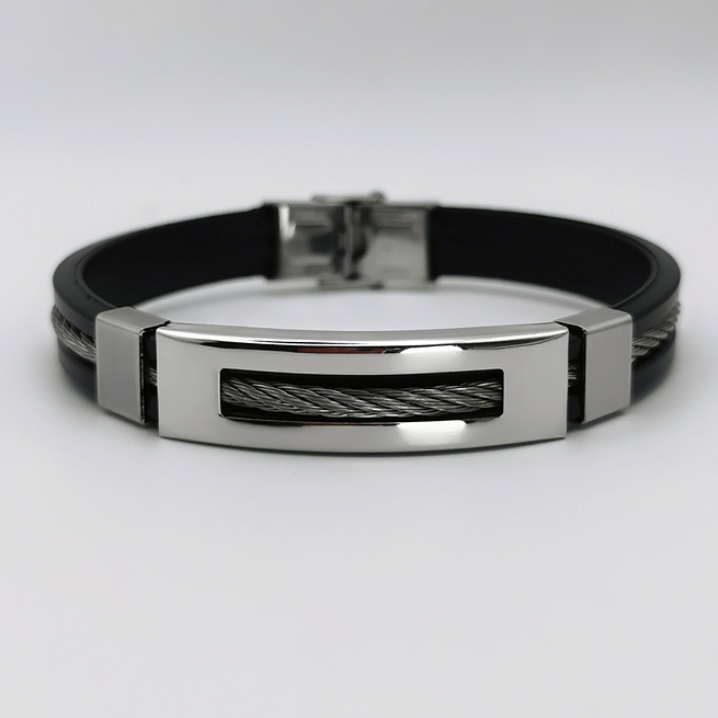 Elegancka męska bransoletka wykonana z wysokiej jakości stali szlachetnej, łącząca w sobie nowoczesny design z klasyczną estetyką. Główny element stanowi polerowana, srebrna płyta, której centralny akcent stanowi pas splecionych, ciemnych włókien, nadających biżuterii niebanalnego charakteru. Całość zaprojektowana została z myślą o mężczyznach ceniących elegancję oraz nowoczesne akcenty w swoim stylu.