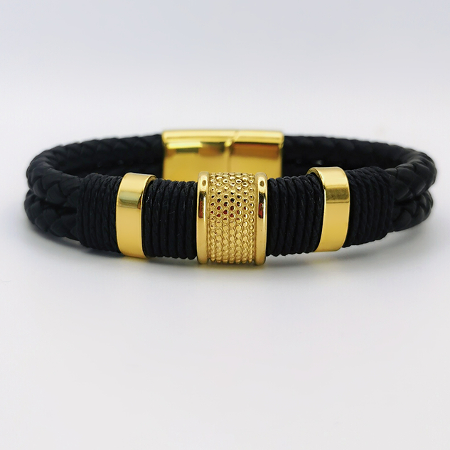 Ta bransoletka jest kwintesencją męskiej elegancji. Czarna, pleciona tekstura łączy się tutaj z złotymi detalami, dodającym całości wyrazistego charakteru. Złote elementy, w tym jeden z interesującą, teksturą przypominającą plastry miodu, są nie tylko ozdobne, ale również świadczą o zamiłowaniu do detali. Zapięcie w kolorze złota dopełnia design, zapewniając zarówno wygodę, jak i bezpieczeństwo noszenia.