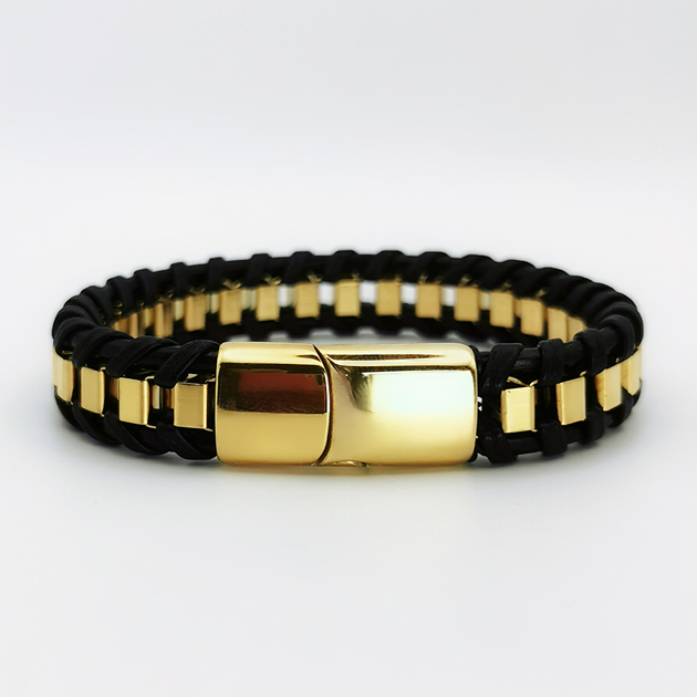 Prezentowana bransoletka łączy w sobie klasyczny urok i nowoczesny styl. Czarna, pleciona tekstura tworzy efektowne tło dla lśniących, złotych elementów, które nadają temu akcesorium eleganckiego wyglądu. Solidne, złote zapięcie nie tylko podkreśla luksusowy charakter bransoletki, ale także zapewnia wygodę oraz łatwość użytkowania.