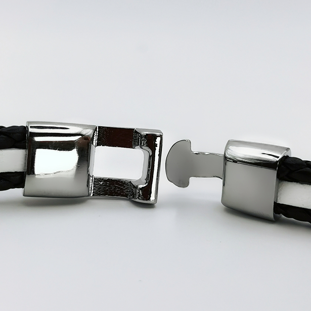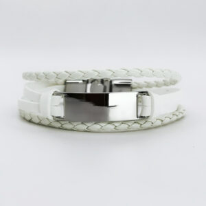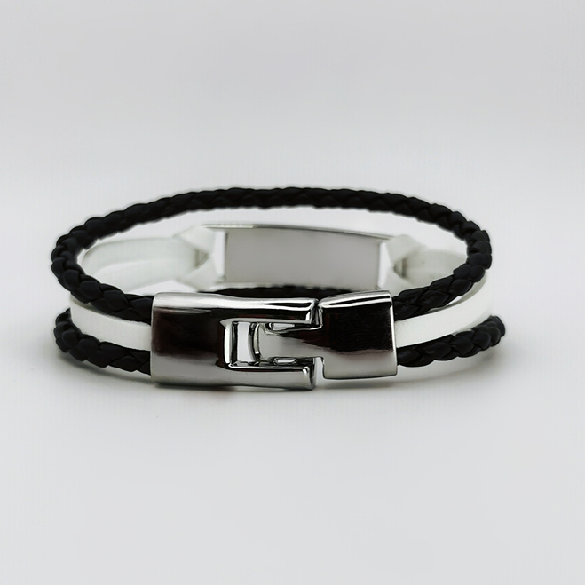 Prezentowana bransoletka to połączenie klasyki i nowoczesności, idealne dla mężczyzny ceniącego sobie minimalistyczny, ale wyrazisty styl. Dwukolorowy design łączy w sobie ciemną plecionkę z błyszczącą, srebrną plakietką, która świetnie odzwierciedla światło i przyciąga spojrzenia. Zapięcie bransoletki, wykonane w tym samym srebrzystym wykończeniu, jest nie tylko eleganckie, ale również funkcjonalne, zapewniając łatwe użytkowanie i wygodę noszenia.
