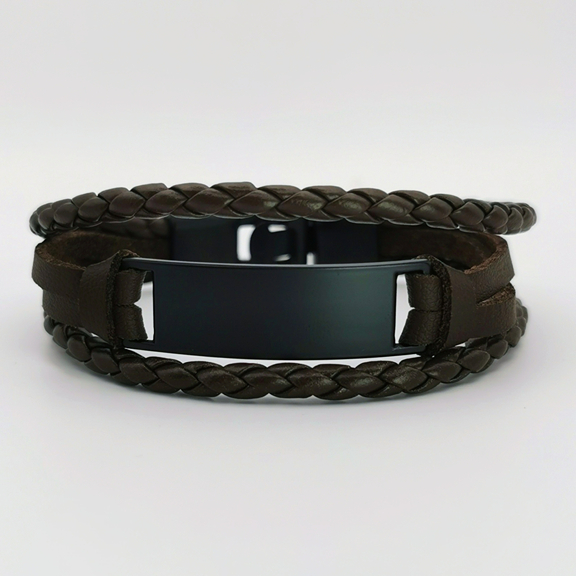 Ta bransoletka to kwintesencja męskiego stylu. Przyciąga wzrok swoim bogatym, ciemnobrązowym odcieniem plecionego paska, który kontrastuje z gładką, centralną plakietką w głębokim, błyszczącym czerni. Metalowe elementy zintegrowane z paskiem są nie tylko praktycznymi zapięciami, ale również dodają charakterystycznego wyglądu. Ta bransoletka to wyrafinowane połączenie klasyki i nowoczesności, idealne dla mężczyzny, który ceni zarówno elegancję, jak i komfort noszenia.