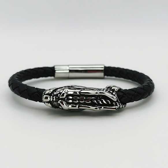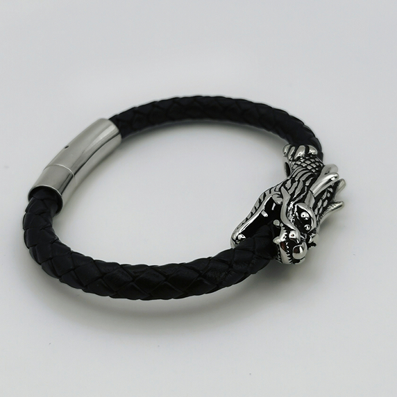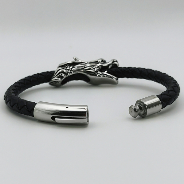 Ta unikatowa bransoletka to połączenie odwagi w designie z klasyczną elegancją. Wykonana z plecionej, czarnej obręczy, która podkreśla męski charakter dodatku, przyciąga wzrok szczególnie dzięki imponującemu, metalowemu elementowi w kształcie mitologicznego smoka. Ta srebrzysta ozdoba, pełna drobnych wytłoczeń i dynamicznych linii, jest centralnym punktem bransoletki, która wyróżnia się na tle konwencjonalnych dodatków.