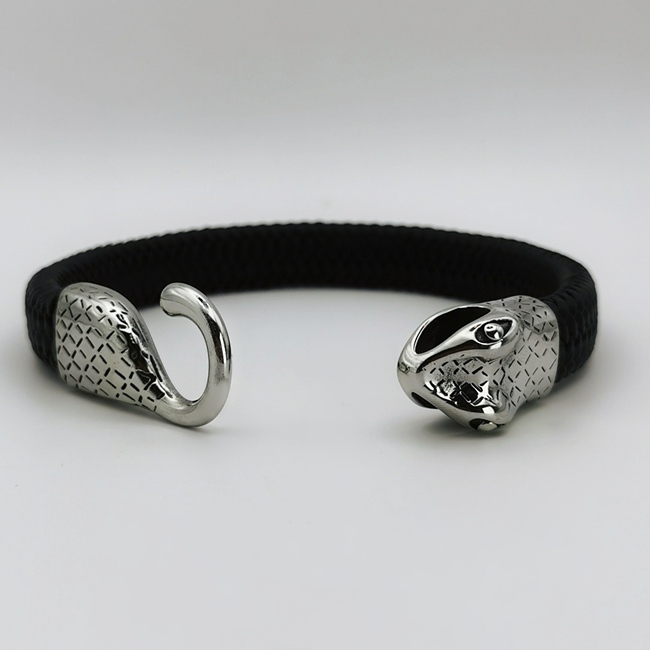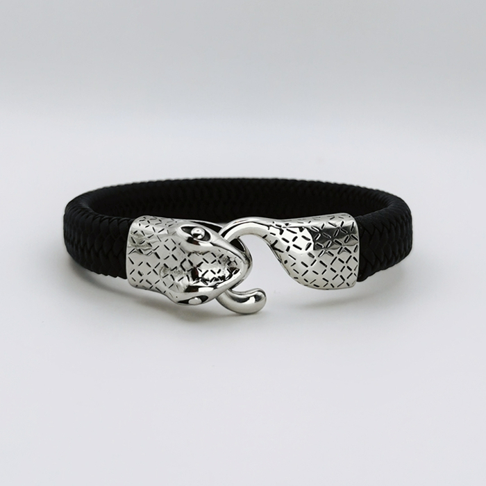 Zaprezentowana bransoletka to połączenie elegancji z nowoczesnym designem. Czarny, elastyczny pasek tworzy doskonałe tło dla srebrnego, metalowego zapięcia przypominającego głowe węża. Wyraźne kształty i błysk metalu nadają akcesorium wyjątkowego, męskiego charakteru.