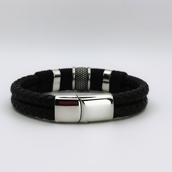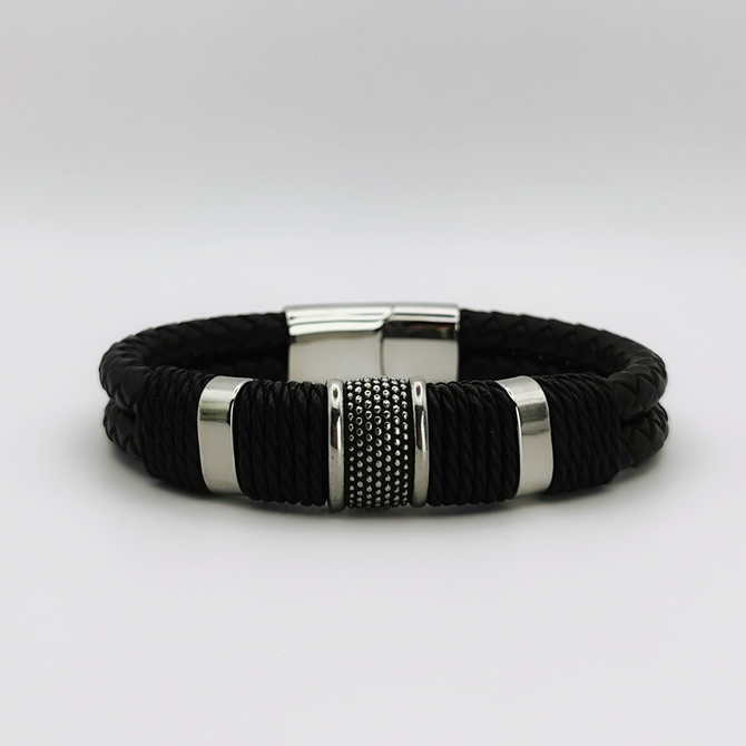 Ta stylowa bransoletka to połączenie nowoczesności i męskiej elegancji. Czarna, pleciona obręcz o wyraźnej teksturze jest podstawą dla błyszczących, srebrnych elementów, które nadają całości wyjątkowego charakteru. Centralny element zdobiony drobnymi, wypukłymi kropkami przyciąga wzrok i stanowi wyrafinowany detal w tej prostej, ale efektownej kompozycji.