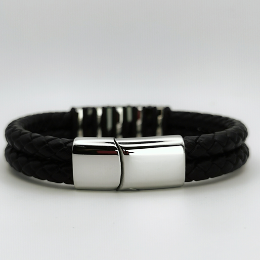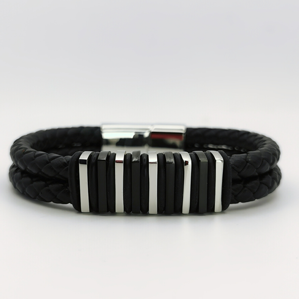 Odkryj bransoletkę, która łączy w sobie odwagę i elegancję – idealną dla nowoczesnego mężczyzny. Plecione, czarne paski tworzą doskonałą bazę dla srebrzystych elementów, które wprowadzają dynamiczny akcent do tego męskiego dodatku. Srebrne segmenty, ułożone w regularne odstępy, nadają bransoletce rytm i charakter, a ich połysk jest subtelny, ale zdecydowany.