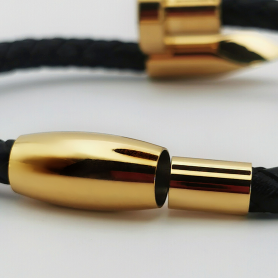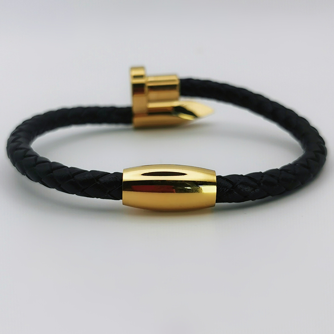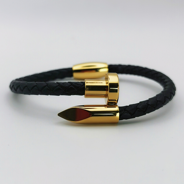 Przedstawiamy bransoletkę, która jest kwintesencją odwagi i wyrafinowania. Czarna, pleciona bransoleta stanowi tło dla zjawiskowych, złotych elementów, które przyciągają spojrzenia i nadają całości niepowtarzalnego charakteru. Wykończenie w postaci złotego zakończenia w kształcie spiczastej głowicy jest odważnym akcentem, który wyróżnia ten dodatek spośród innych.