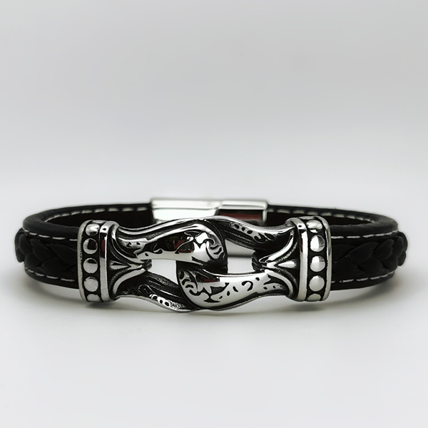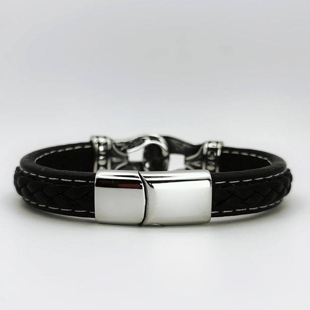 Mocne, czarne plecionki tworzą harmonijny kontrast z lśniącym, metalowym zapięciem, które stanowi zarówno praktyczny jak i wizualny środek bransoletki. Zwracające uwagę zdobienia zapięcia są nie tylko estetyczne, ale również wyrażają osobowość noszącego. Odblaski światła na metalu podkreślają dynamikę i śmiałość formy, a jednocześnie zachowują subtelność i klasę.