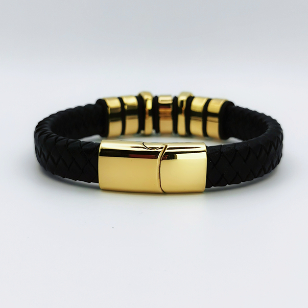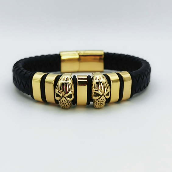 Ta męska bransoletka to odważny dodatek, który łączy w sobie elegancję i nowoczesny buntowniczy design. Czarny, pleciony pasek z ekologicznej skóry tworzy kontrast z wyrazistymi, złotymi elementami, które dodają całości luksusowego charakteru. Centralnym punktem są dwie złote czaszki, które stanowią nie tylko ozdobę, ale i symbol siły oraz odwagi.